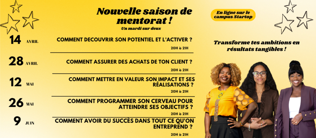 - Propulser ta carrière ou ton projet : Aligner ton potentiel avec tes objectifs pour obtenir des résultats tangibles.Le mentorat se poursuit sur le Campus Startop !